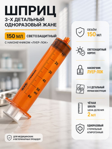Шприц 3-х детальный одноразовый ., Жане 150 мл, светозащитный, с наконечником "Луер-Лок" до 08.2027