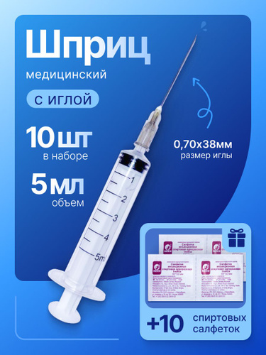 Шприцы 5 мл набор 10 шприцев + 10 салфеток 65х30