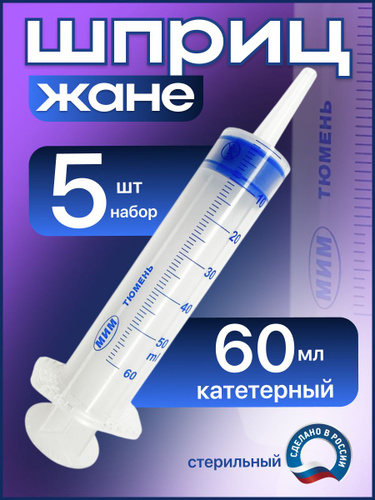 Шприц Жане 60 мл. стерильный. Катетерный шприц медицинский трехкомпонентный. Набор 5шт.