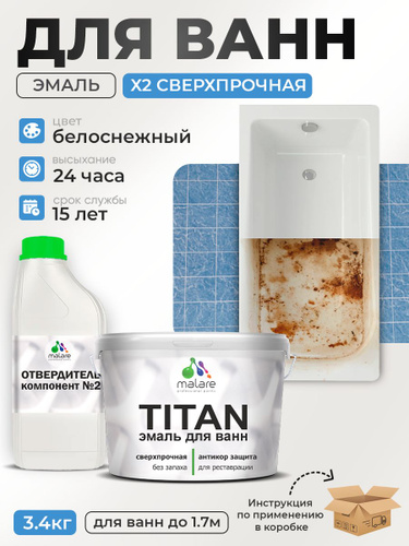 Жидкий акрил для ванн Malare Titan / Эпоксидная эмаль для реставрации и защиты поверхности ванн раковин душевых поддонов, водостойкая сверхпрочная, глянцевая, белая 3,5 кг