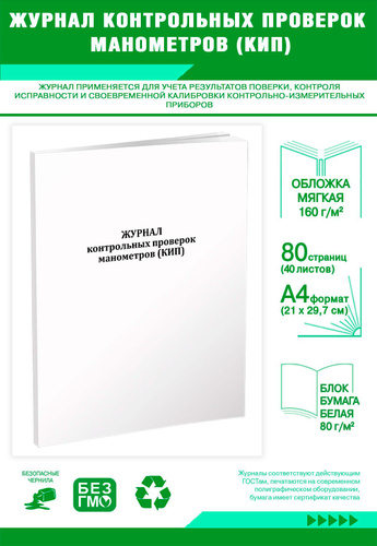 Книга учета. Журнал контрольных проверок манометров (КИП). 80 страниц