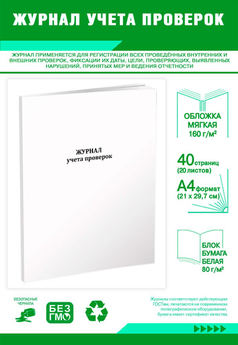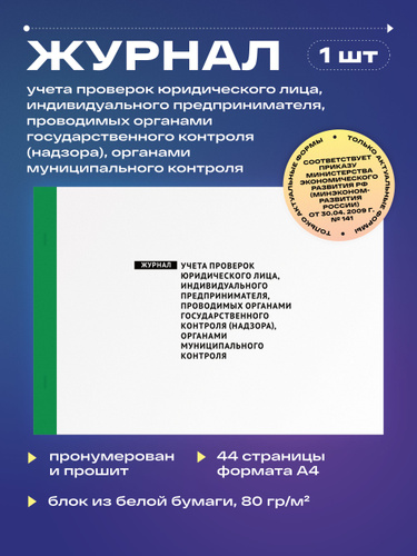 Журнал учета проверок юридического лица, индивидуального предпринимателя, проводимых органами государственного контроля (надзора), органами муниципального контроля, 22 листа, прошит (1шт)