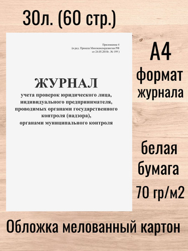 Журнал учета проверок юридического лица, индивидуального предпринимателя, проводимых органами государственного контроля(надзора), органами муниципального контроля 30л. (60 стр.)