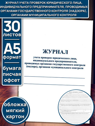 Журнал учета проверок юридического лица, ИП А5, 30л, картонная обложка, белая бумага