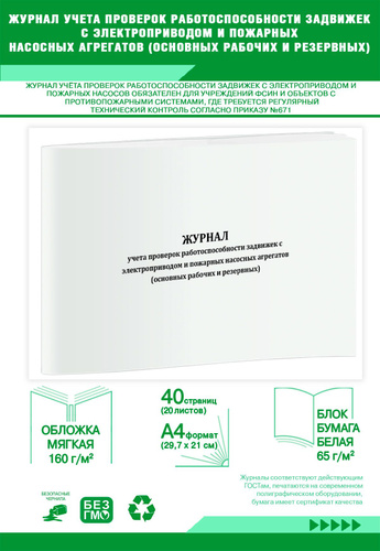 Журнал учета проверок работоспособности задвижек с электроприводом и пожарных насосных агрегатов (основных рабочих и резервных). 40 страниц