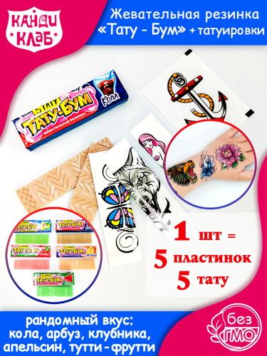 Жевательная резинка ТАТУ БУМ + татуировки (1 упаковка - 5 пластинок) конфеты Канди Клаб. Набор ассорти клубника, апельсин тутти-фрутти, арбуз кола + наклейки. Подарок детям на день рождения, Новый год