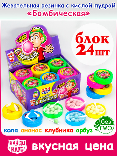 Жевательная резинка БОМБИЧЕСКАЯ с кислой пудрой (блок 24шт по 15гр) конфеты ассорти Канди Клаб. Жвачка со вкусом клубника, арбуз, кола, ананас. Набор в подарок на праздник, день рождения, Новый год