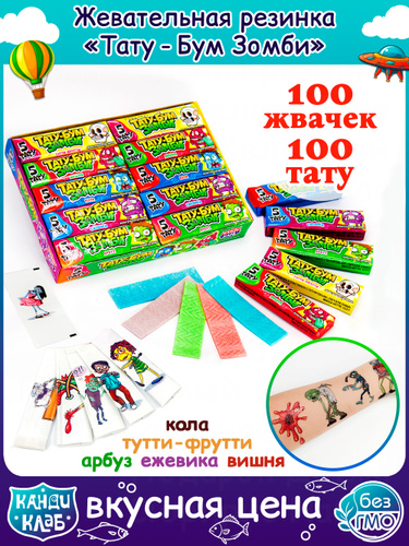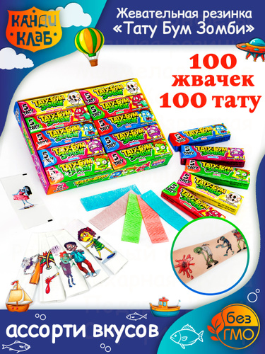Жевательная резинка ЗОМБИ ТАТУ БУМ с тату (блок 100 жевачек - 20 упаковок по 5 пластинок) конфеты Канди Клаб. Набор жвачек вкус тутти-фрутти, арбуз вишня ежевика, кола в подарок на Хэллоуин, Новый год