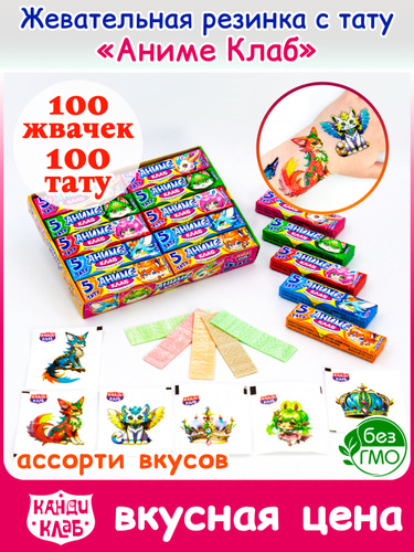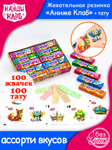Жевательная резинка ТАТУ БУМ АНИМЕ татуировки и жвачки (блок 100шт 20 упаковок по 5 пластинок) конфеты Канди Клаб. Набор жвачек ассорти клубника апельсин, тутти-фрутти, арбуз, кола + подарок наклейки