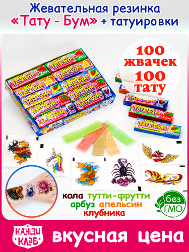 Жевательная резинка Тату Бум ассорти ( клубника, кола, апельсин, тутти-фрутти, арбуз ) блок /20 шт, Канди Клаб ( жвачка татуировка )