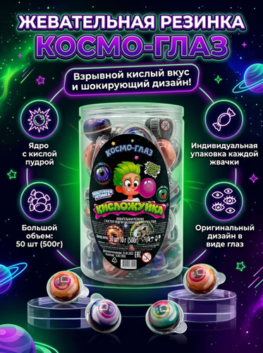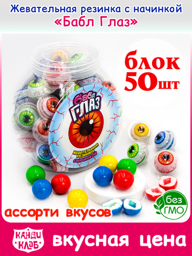 БОЛЬШАЯ жевательная резинка БАБЛ ГЛАЗ с начинкой (блок 50шт по 12гр) конфеты Канди Клаб. Набор жвачек ассорти кола, клубника, арбуз, тутти-фрутти. Жевачки подарок на день рождения, Новый год, Хэллоуин