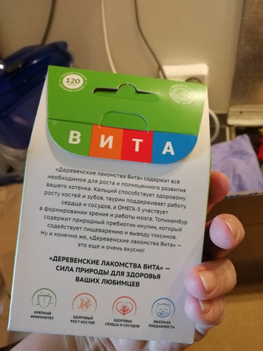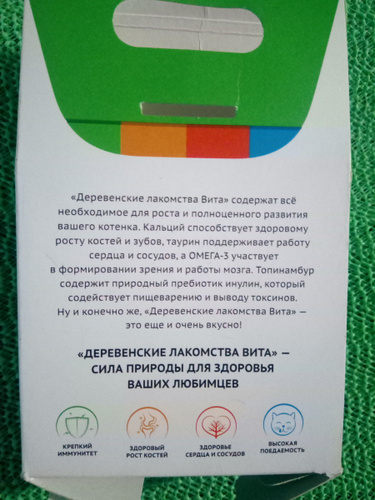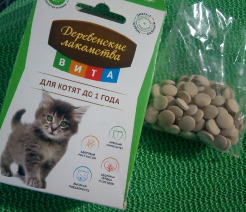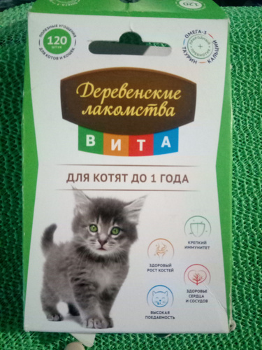 "Деревенские лакомства Вита" содержат всё необходимое для роста и полноценного развития вашего котенка. Кальций способствует здоровому росту костей и зубов, таурин поддерживает работу сердца и сосудов, а ОМЕГА-3 участвует в формировании зрения и работы мозга. Топинамбур содержит природный пребиотик инулин, который содействует пищеварению и выводу токсинов. Ну и конечно же, "Деревенские лакомства Вита" — это еще и очень вкусно!