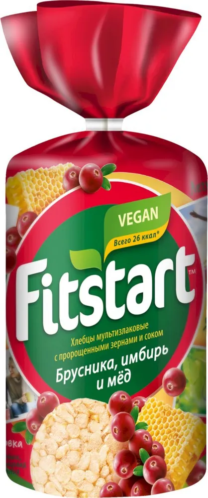 смесь злаков (пшеница, крупа рисовая, крупа гречневая, рожь, хлопья овсяные пророщенные), сок брусники концентрированный, имбирь молотый, соль поваренная, подсластитель сукралоза, ароматизаторы натуральные "Брусника" и "Мед", гранулы медовые (глюкоза, мед).