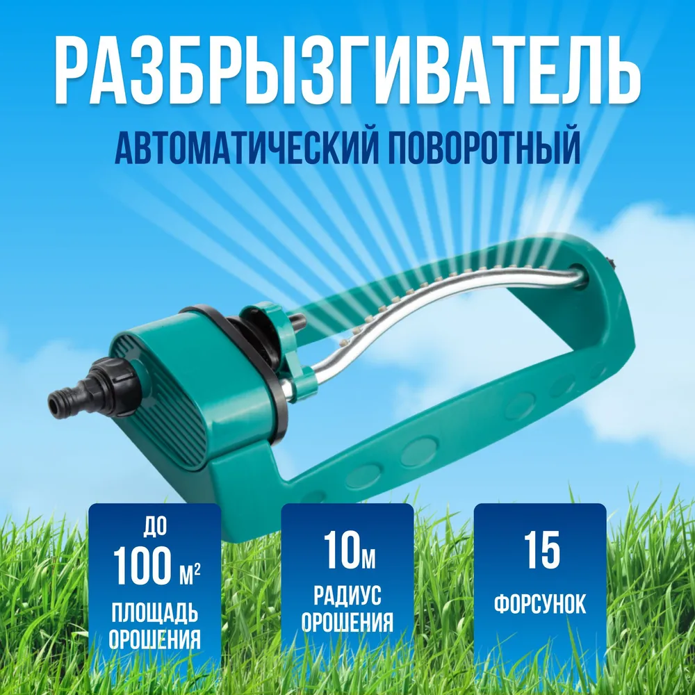 - Разбрызгиватель присоединяется к стандартному шлангу с помощью быстросъемной конструкции. Корпус изготовлен из легкого ударопрочного ABS-пластика. Регулировка поворота осциллирующего блока обеспечивает равномерный полив прямоугольного участка заданной площади. Диаметр опрыскивания 9-10 м. Насадка 15 форсунок.