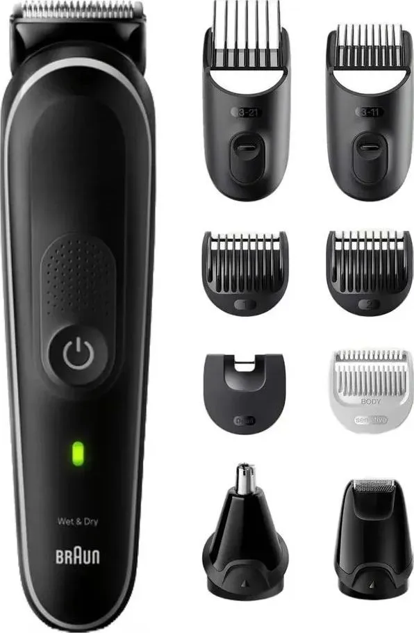 Триммер для бороды, насадки-гребни - 4 шт., насадка для точного бритья, насадка для носа и ушей, насадка для чувствительных зон, зарядное устройство, мягкий чехол, щеточка для чистки, документация.
