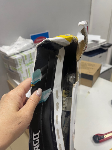 Мало того, что дырка в коробке, что аж кулак просунуть можно, так ещё и наклеек нет!