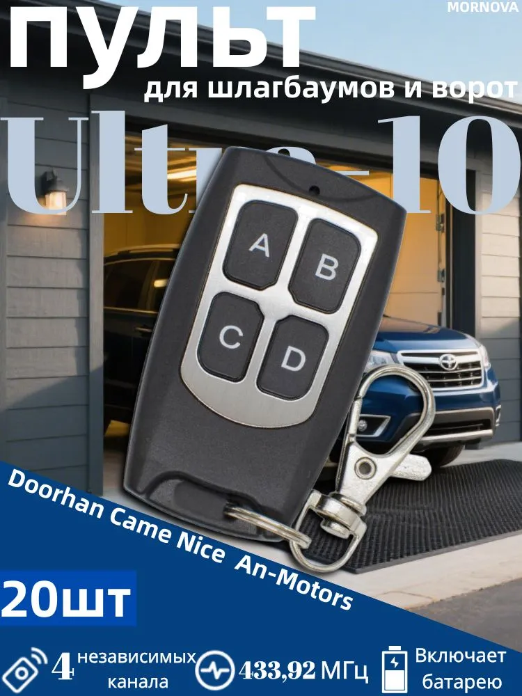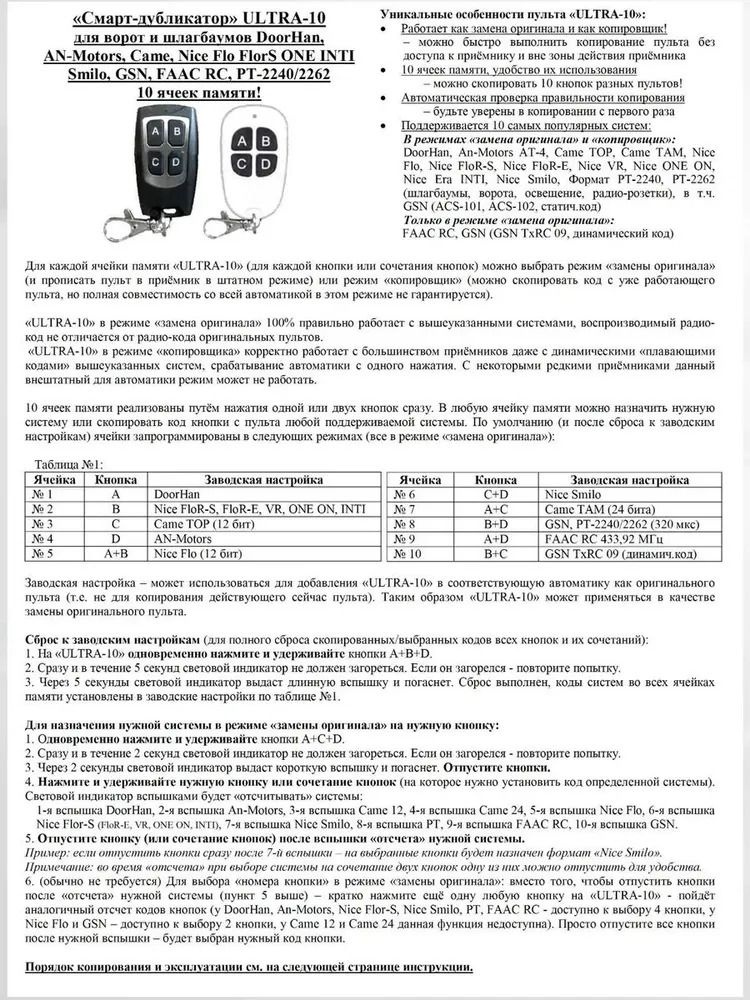 ULTRA-101. Можете заменить оригинальные пульты популярных систем: DoorHan, AN-Motors AT-4, Came TOP/TAM 12bit/24bit, Nice FLO, Flor-S (тоже что и и NICE серии Flor-E, ON, ONE, Era INTI, VERY), Slimo, GSN со статическим и динамическим кодом, Faac RC. Нужная система назначается на любую кнопку пульта ULTRA-10. Пульт добавляется в автоматику назначенной системы также, как оригинальные пульты.