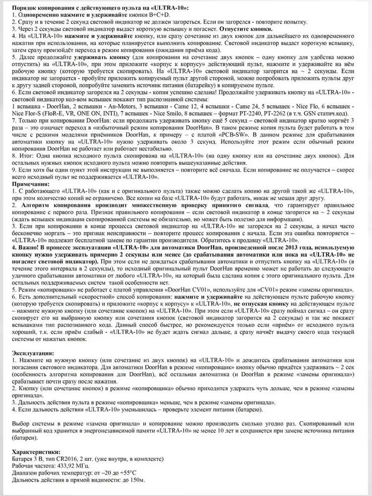 «ULTRA 10»Уникальные осооенности пульта «ULTRA 10»:• Работает как замена оригинала и как копировщик!- можно быстро выполнить копирование пульта без доступа к приёмнику и вне зоны действия приёмника• 1О ячеек памяти, удобство их использования- можно скопировать 10 кнопок разных пультов!• Автоматическая проверка правильности копирования- будьте уверены в копировании с первого раза• Поддерживается 1О самых популярных систем:В ре:нсимах «замена оригинала» и «копировщик»: DoorHan, An-Motors АТ-4, Саше ТОР, Саше ТАМ, Nice Flo, Nice FloR-S, Nice FloR-E, Nice VR, Nice ONE ON, Nice Era INТI, Nice Sшilo, Формат РТ-2240, РТ-2262 (шлагбаумы, ворота, освещение, радио-розетки), в т.ч. GSN (ACS-101, ACS-102, статич.код)Только в ре:нсиме «замена оригинала»:FAAC RC, GSN (GSN TxRC 09, динамический код)