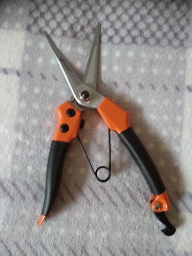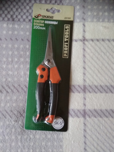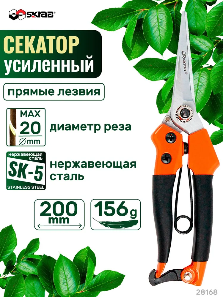 Ножницы садовые усиленные 200мм SK5 "Skrab", 28168. Тип секатора усиленный. Общая длина 200 мм. Лезвия прямые, 65 мм, японская сталь SK5. Ручки эргономичные, прорезиненные. Производитель SKRAB. Страна изготовитель Тайвань . Садовые секаторы SKRAB незаменимы на загородном участке при подрезке жестких, сухих кустарников и веток. Острые, долговечные лезвия, изготовленные из японской стали SK5, поддаются заточке. Прямая форма лезвий секатора напоминает ножницы и дает возможность аккуратно и без усилий отрезать труднодоступную ветку, не повредив соседние. Вследствие небольших габаритных размеров, легкого веса и эргономичного дизайна секаторов SKRAB снижается нагрузку на мышцы, увеличивается производительность труда. Усиленные секаторы SKRAB 28168 оснащены механизмом блокировки лезвий, благодаря которому Вы можете быть уверенны в безопасности при перевозке и хранении инструмента. После использования необходимо очистить инструмент и вытереть насухо лезвие. При длительном хранении требуется консервация изделия (моторное масло и т.д.). Удобный и прочный многоцелевой секатор предназначен для разных обрезных работ. Подходит для удаления увядших цветов, для срезания растений и тонких веток, шнура, проволоки, резины. Верхнее лезвие изготовлено из специальной закаленной стали. Секатор оснащен безопасной блокировкой в виде предохранительной защелки.