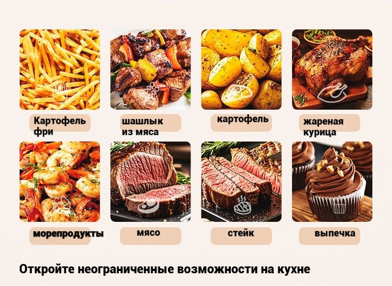 меню на 8 цветных дисплеях: Картофель фри, шашлыки, сладкий картофель, курица-гриль, креветки, барбекю, стейк, пирожное