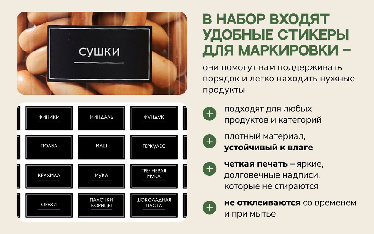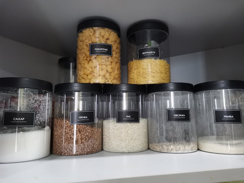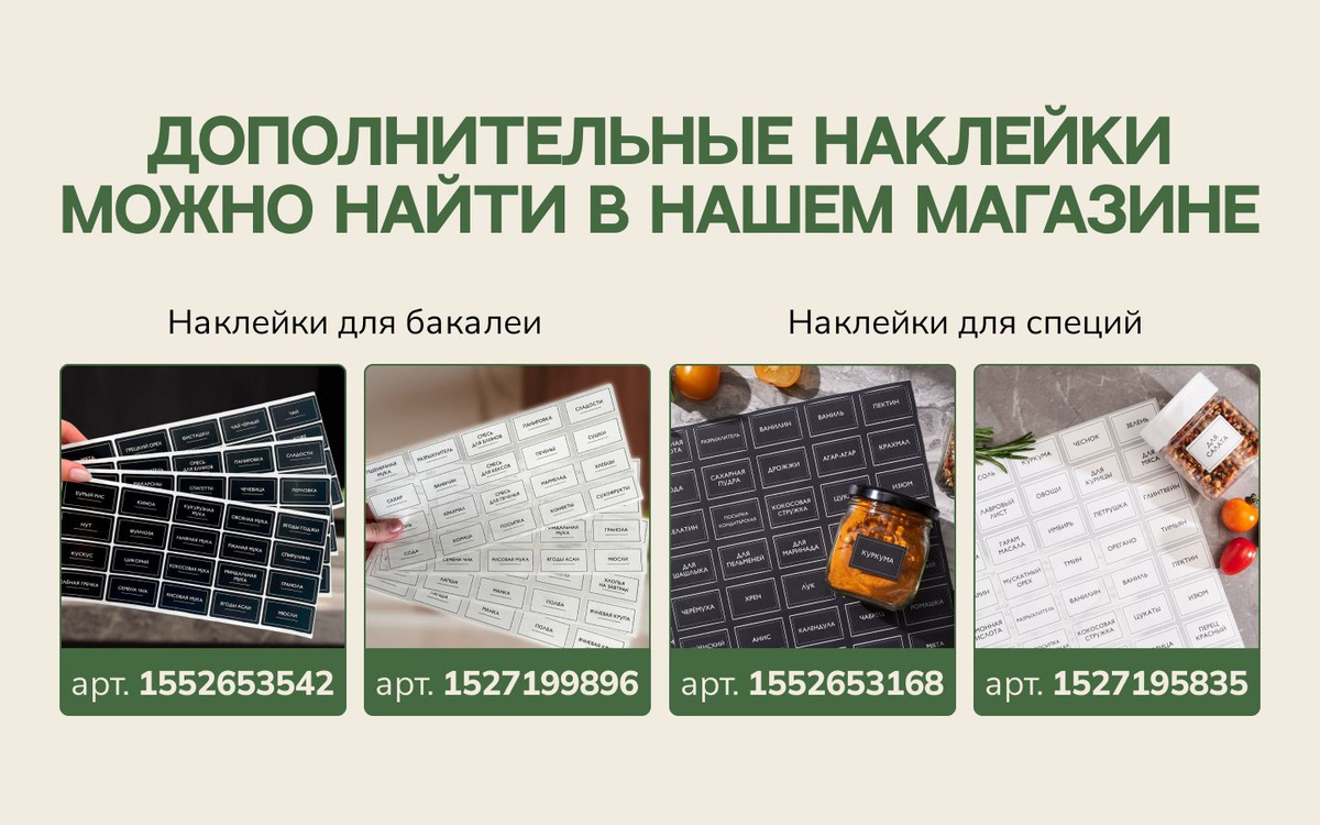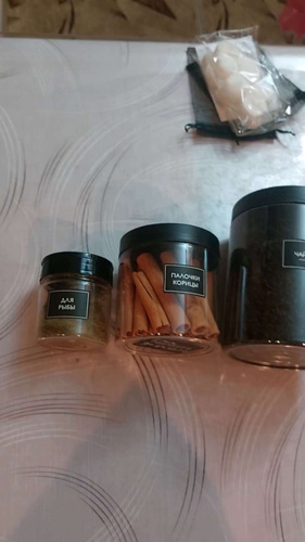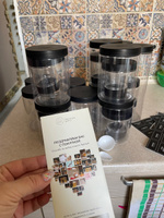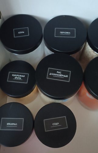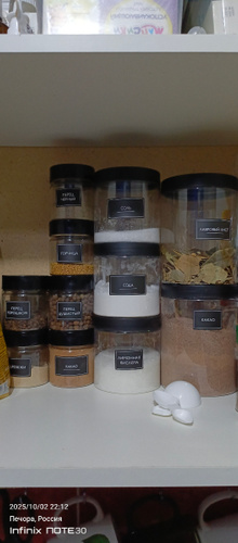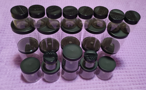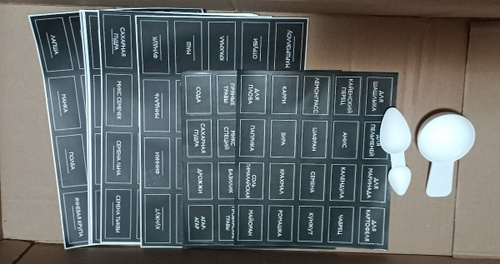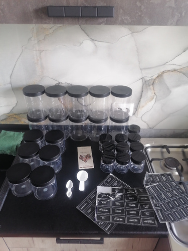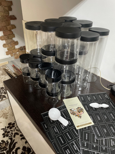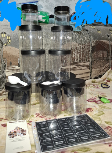 Банки - 16 штук, Крышки - 16 штук из пищевого пластика, Мерная ложка; Набор стикеров (120 шт.) - полипропиленовая пленка (не подлежит вторичной переработке)