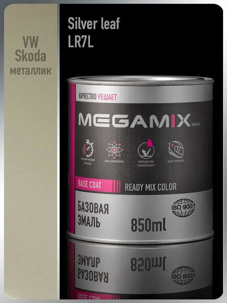 Базовая эмаль, "MEGAMIX", VW/SKODA SILVER LEAF LR7L, 0.85 л - 1 шт Марки авто для этого цвета: VW/SKODA Beetle, Bora, Golf, Passat CC, Phaeton, Scirocco, Beetle Cabrio, Jetta, Touran, Transporter, Passat, CrossTouran, Eos, Touareg, Polo, Sharan, Tiguan/ Citigo, Octavia, Rapid, Yeti, Fabia
