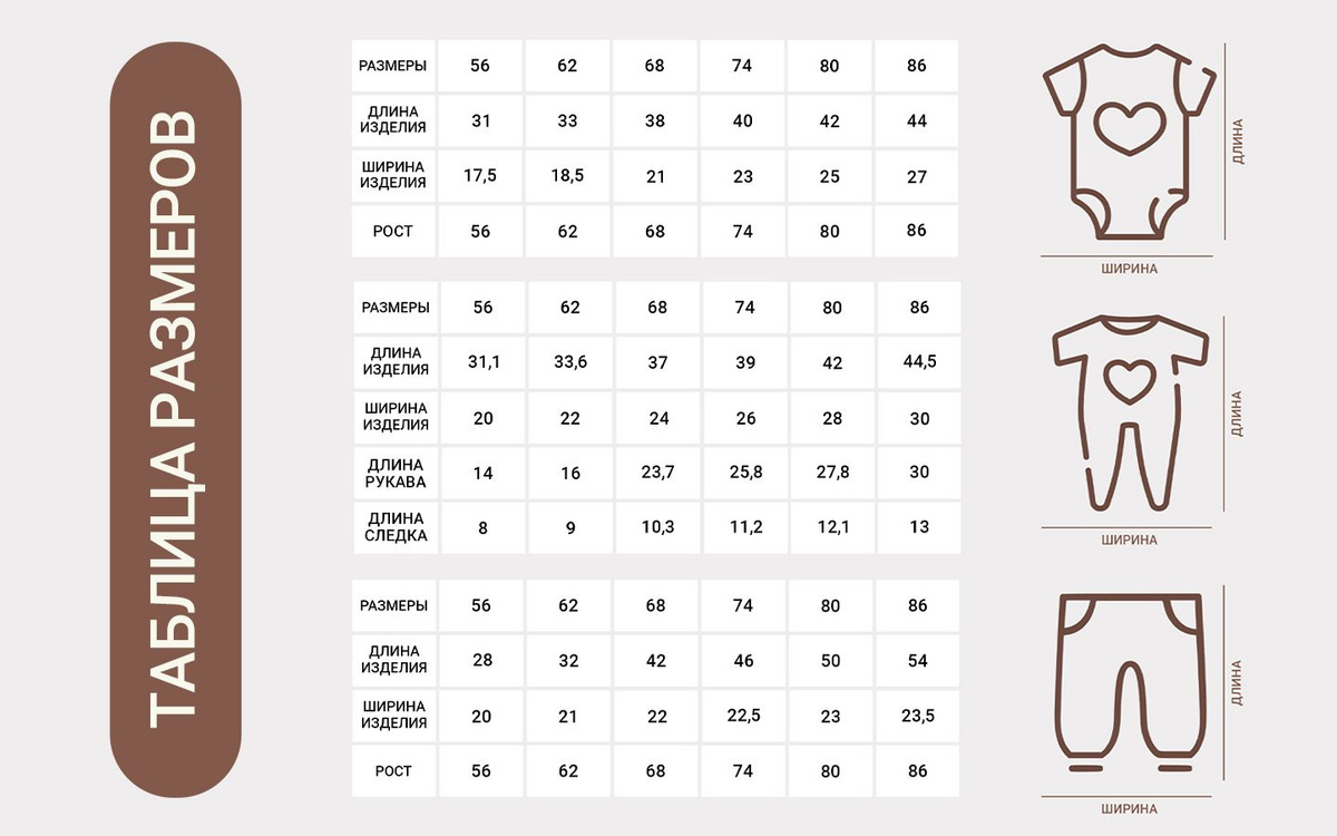 Добрый день! Благодарим за обращение! У нас в карточках представлена общая таблица размеров для всех боди. С уважением к Вам, Mark Formelle!