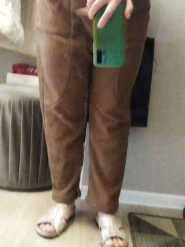 Брюки хорошие, только резинка слабая совсем, весь день подтягивала выше, отворотов тоже нет, карманы сзади почти на ногах, не понятно так задумано или брак. А так мягкие и тепленькие.