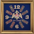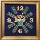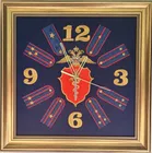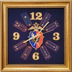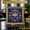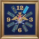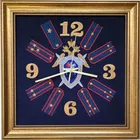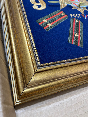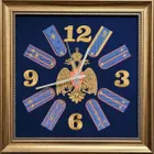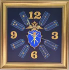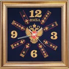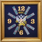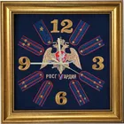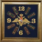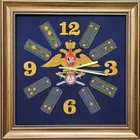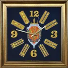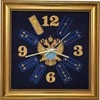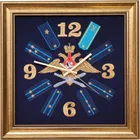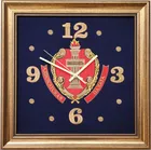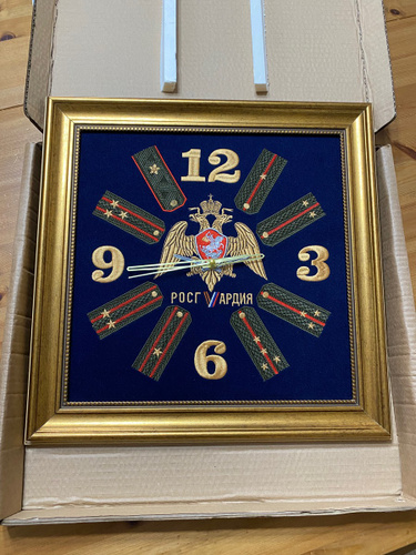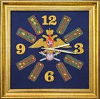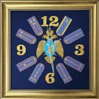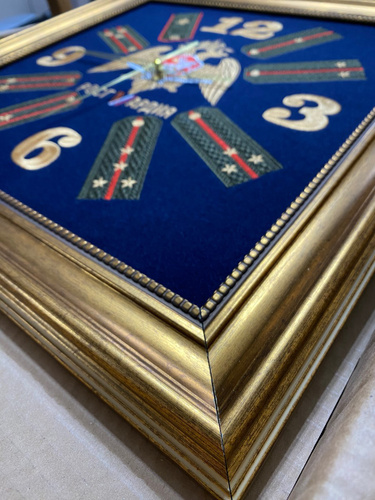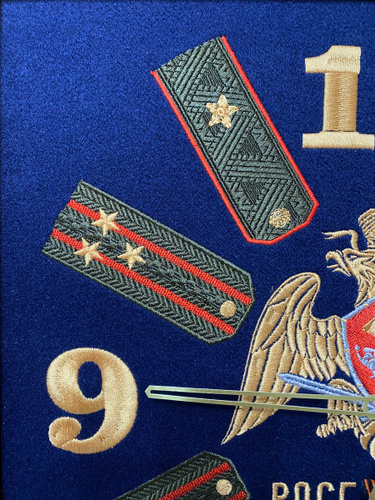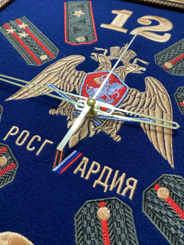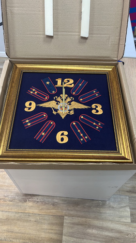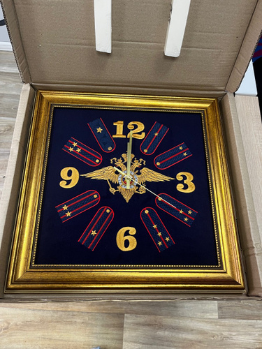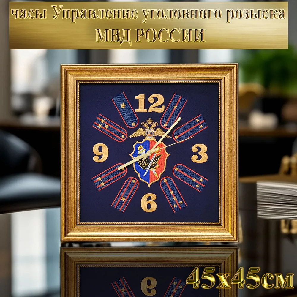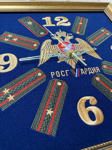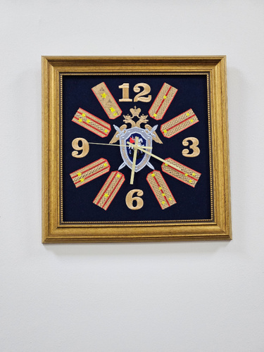 Студия машинной вышивки Golden Stitch предлагает уникальные настенные часы с символикой УУР МВД РФ (Управления уголовного розыска Министерства внутренних дел России) с бесшумным ходом, с изысканной багетной рамой премиум качества и великолепной машинной вышивкой на сукне, изображающей офицерские погоны.