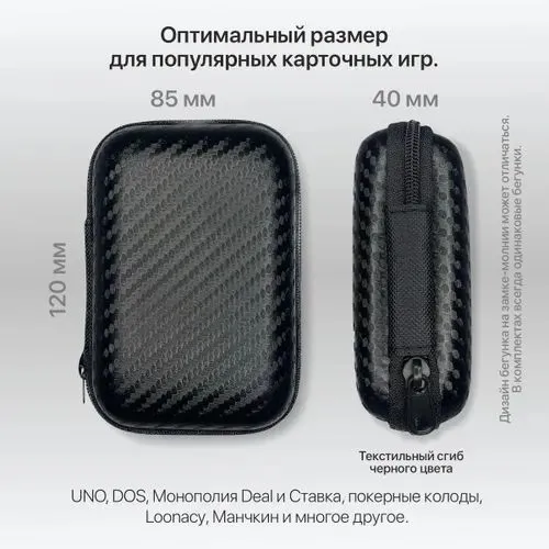 Чехол для хранения игральных карт с жестким корпусом - это лучший аксессуар нового поколения. В чехол-кейс для игральных карт влезает колода 36 карт, 54 карты или 112 карт. В чехле можно хранить Ваши любимые карточные игры: UNO (карты УНО), Свинтус, Monopoly Deal (Монополия Диал), Dos (Дос), Мухобойка, Хугермугер, карты аниме Genshin Impact (Геншин), карты игральные пластиковые, обычные карты для игры, карты для покера, карты ТАРО. Внутри есть кармашек сетка - можно хранить карты, кубики для игры (в том числе кубики для днд (DnD), дайсы, игральные кости), правила игры, фишки игральные, инструкцию. Универсальный чехол можно использовать как удобный и компактный кейс для хранения наушников, проводов, таблеток, лекарств, глюкометра, украшений и различных мелочей, которые пригодятся в дороге, путешествии или отпуске. Ударостойкий портативный картхолдер закрывается на надежную молнию. Защитный жесткий качественный универсальный чехол для хранения карт, наушников, проводов, кабелей, зарядных блоков питания, денег, карт памяти, игральных карт и других небольших аксессуаров имеет термо-влагостойкий, противоударный корпус с карманом-сеткой. Размер кейса 120x85x40.