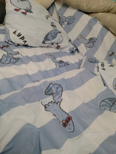 ООООО!!!! Это любовь с первого взгляда. Покупаю такой третий комплект: черный дочке с зятем, синий - внуку, теперь серый для сына. Гуси - прикольные, надписи - смешные. Очень все позитивно. Поднимает настроение. Внук (6 лет, начинает читать), ползает по постели, все читает, сам себе восторгается. Кроме того, комплект из поплина. Это самая качественная...  Читать полностью