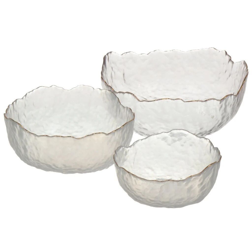 Эстетика и изящество: Прозрачное однотонное стекло, фигурная форма и элегантная золотая окантовка придают салатникам роскошный и современный вид.