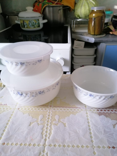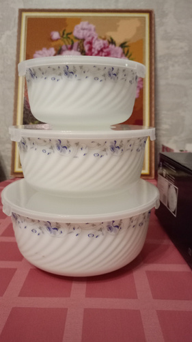 Данный набор имеет три салатника.Теперь можно украсить праздничный стол различными салатиками и закусками в этих красивых салатничках. Будет всё смотреться гармонично,а самое главное,если что-то останется,можно закрыть крышкой,и убрать в холодильник. Чем хороша посуда из стеклокерамики;во-первых,она не впитывает в себя запахи,отлично моется и подходит для подачи различных блюд,как холодных ,так и горячих. Радует глаз своим изяществом и красотой. Советую к покупке,и конечно же данного продавца. Закажу ещё один.😉🥰
