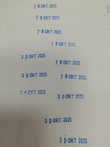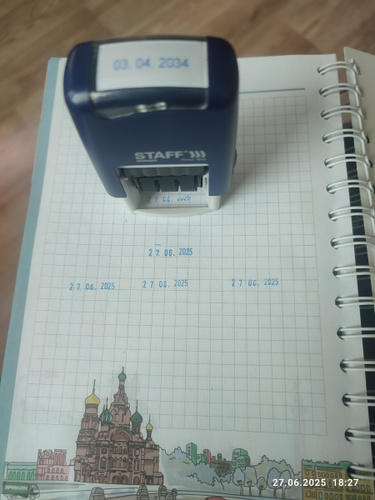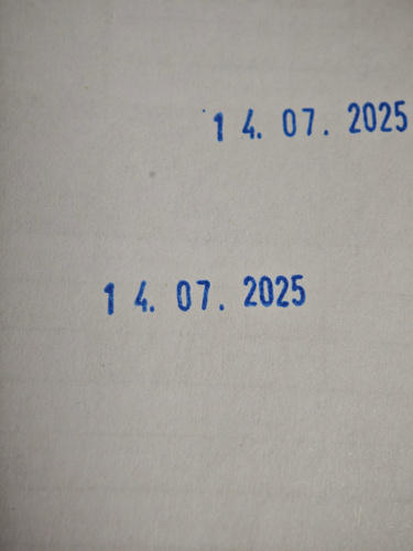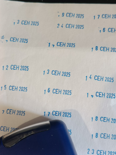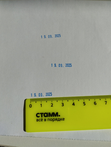 Нужно прикладывать усилия ,чтобы поставить печать,иначе не полностью печать проставляется.Циферблат двигается с трудом ,идет туго.Расстояние между месяцем и годом нет,как будто сплошным текстом.Неоднозначные впечатления.Цена приятная.