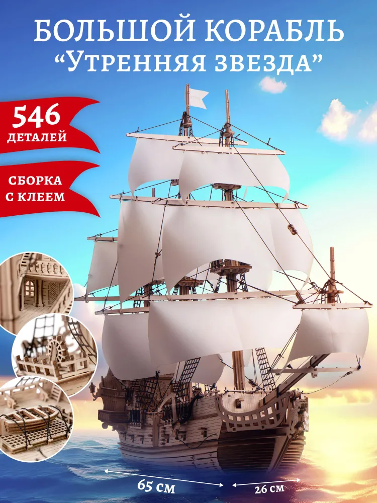 Деревянный конструктор, сборная модель корабля Lemmo Утренняя Звезда (белые паруса)  #1