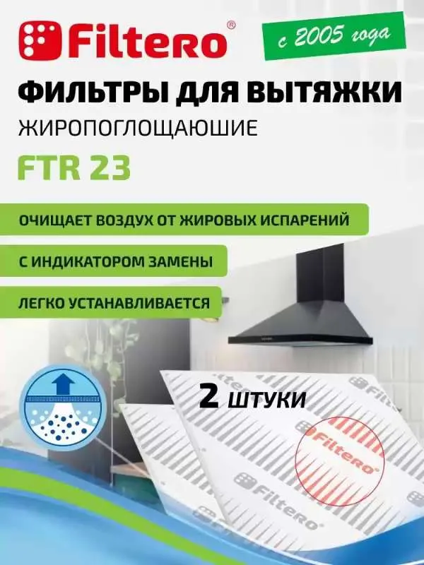 Жиропоглощающий фильтр Filtero FTR 23Жиропоглощающий фильтр Filtero FTR 23 поглощает грязь и частицы жира, он предназначен для снижения содержания продуктов неполного сгорания газа в воздухе и предотвращения загрязнения потолков и стен кухни от сажи и копоти, а также для увеличения срока эксплуатации мотора вытяжки. Эксплуатация вытяжки не желательна без этого фильтра.