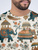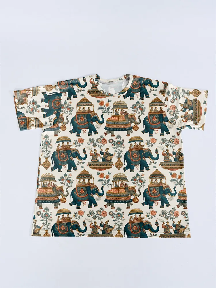 Наша футболка с принтом представляет собой галерею традиционного индийского искусства на ткани. Центральное место занимают величественные слоны в праздничных попонах, украшенные сложными орнаментами и несущие наездников в роскошных одеяниях. Вокруг них разворачивается динамичная сцена: музыканты играют на традиционных инструментах, танцоры замерли в изящных позах, а придворные участвуют в торжественной процессии. Фон заполнен характерными для каламкари-узоров цветочными гирляндами, декоративными вазами и геометрическими бордюрами. Насыщенная палитра сочетает глубокие синие тона, жизнерадостный оранжевый, благородное золото и мягкий бежевый, создавая ощущение подлинного индийского праздника. Каждый сантиметр ткани рассказывает историю, а бесшовная композиция создает эффект живой миниатюры.