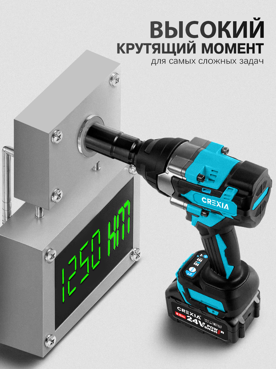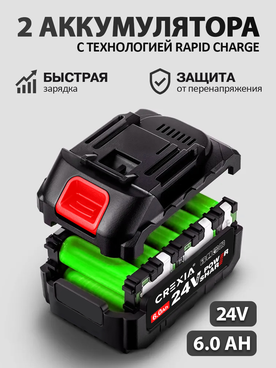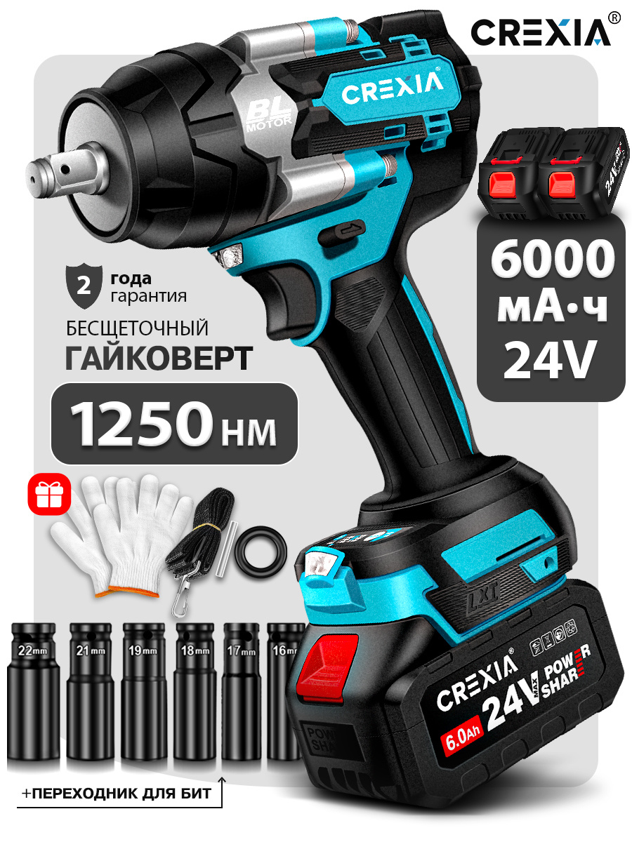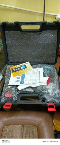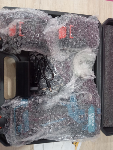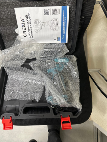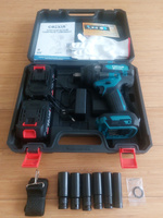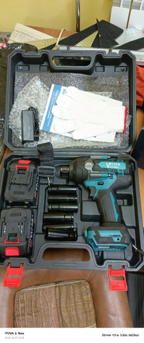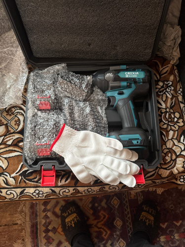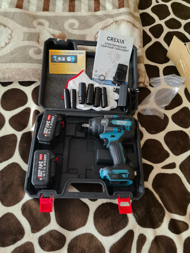 ·1 × Гайковёрт; ·2 × Аккумулятор 6000 мАч; ·6 × Насадки; ·1 × Пояс для инструментов; ·1 × Перчатки; ·1 × Резиновое кольцо; ·1 × 3ащёлка; ·1 × Зарядное устройство; ·1 × Руководство пользователя; ·1 × Keйс;