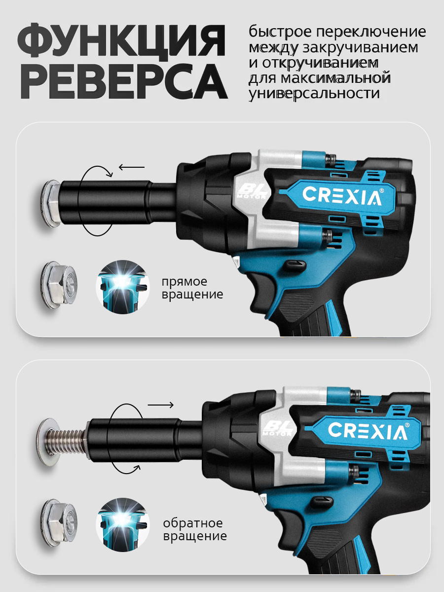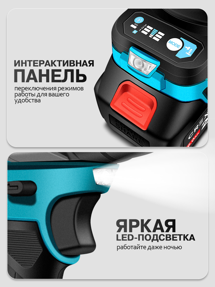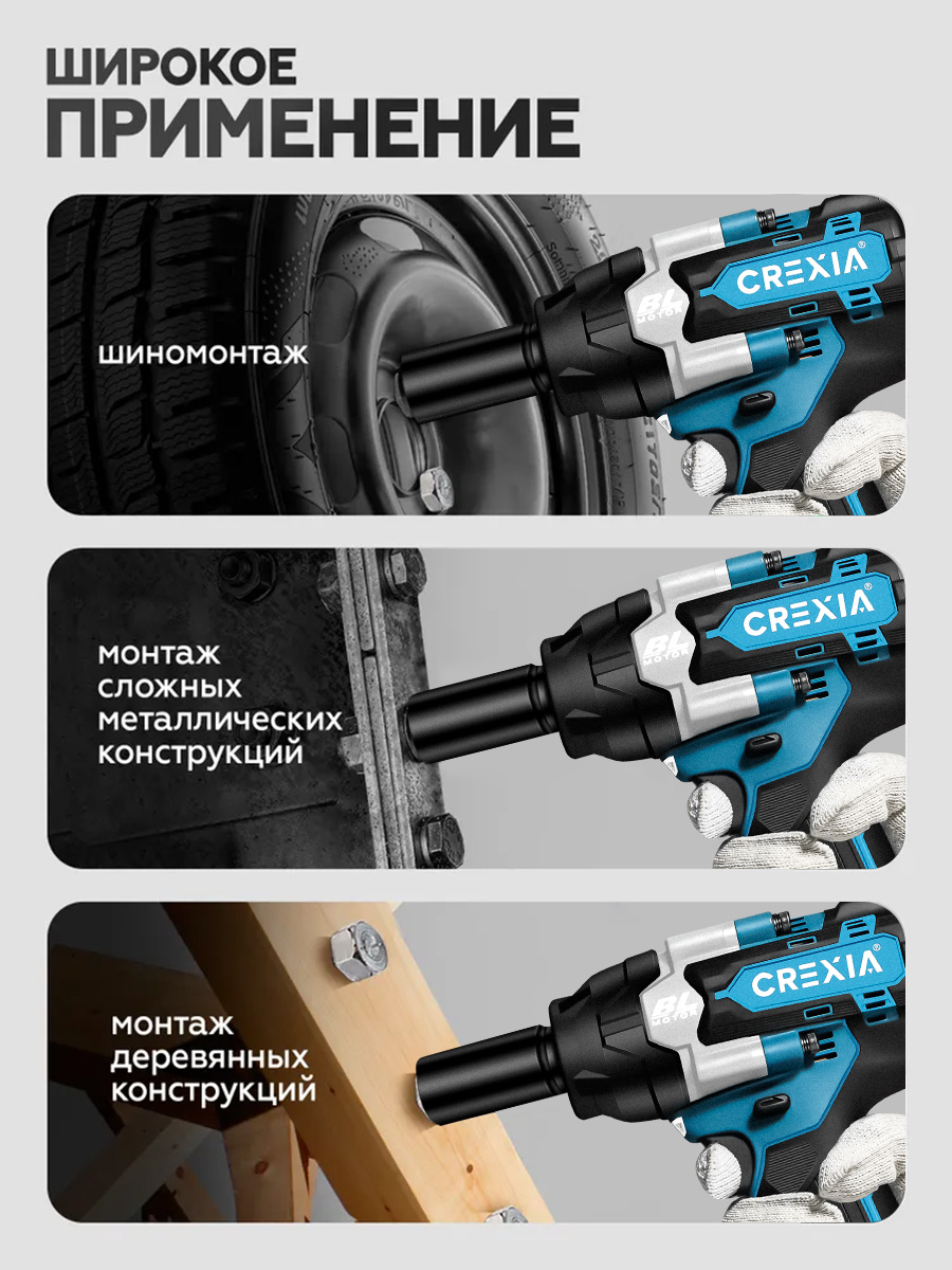 ·1 × Гайковёрт; ·2 × Аккумулятор 6000 мАч; ·6 × Насадки; ·1 × Пояс для инструментов; ·1 × Перчатки; ·1 × Резиновое кольцо; ·1 × 3ащёлка; ·1 × Зарядное устройство; ·1 × Руководство пользователя; ·1 × Keйс;