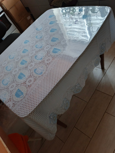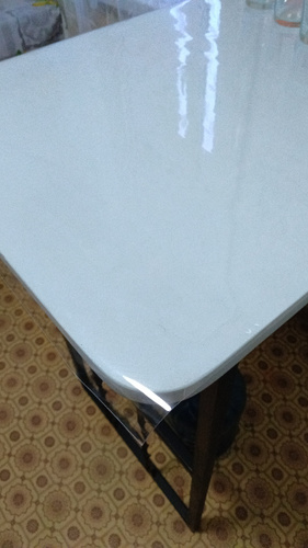 постелила на стол скатерть, сверху укрыла прозрачным бесцветным гибким стеклом и обрезала его вровень с краями столешницы, чтобы твёрдые острые края стекла не свисали по краям. оно прилипло очень ровно, без пустот. но сначала два дня лежало на столе неприклееннное, чтобы распрямилось.