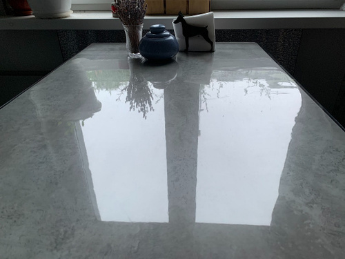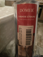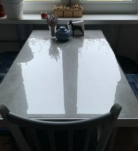 Заказала гибкое стекло 1,5 мм. Пришло свернутым в трубочку, в плёнке и слегка примятое сбоку. При получении немного посомневалась в его качестве, но забрала домой... Когда развернула, мне оно сразу понравилось: и толщина хорошая, и прозрачное-гладкое, и наощупь приятное. В первую очередь я вымыла стекло в ванной тёплой водой с хоз. мылом и досуха вытерла. Положила на стол (столешница из искусственного камня). Места вмятинок слегка бугрились и были лёгкие волны от пребывания в рулоне, со временем бугорки и волны стали пропадать. Прошло 5 дней с получения, сейчас стекло разгладилось и мне очень нравится (см. фото). На столешницу стекло очень хорошо легло - никаких прилипаний и разводов при соприкосновении со столом. Запаха от стекла не чувствовала (сейчас лето и окна всегда открыты).