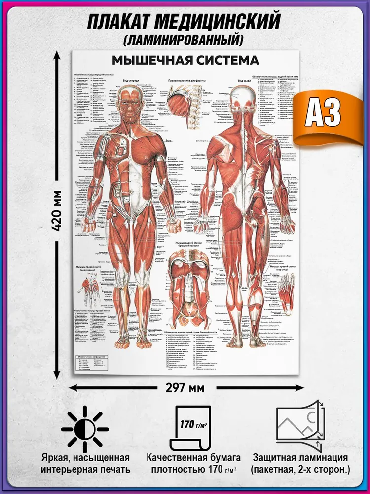 Медицинский плакат Мышечная система человекаЯркий и информативный плакат - наиболее доступный и практичный способ оформить медицинский кабинет, класс биологии или анатомии.