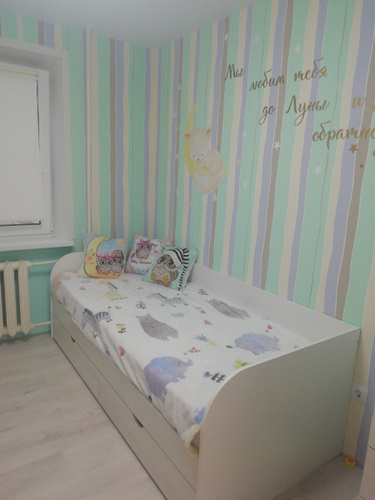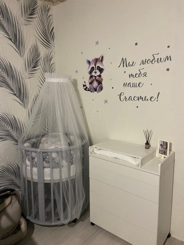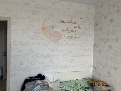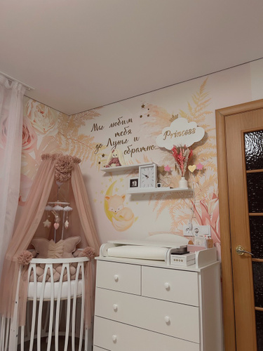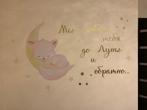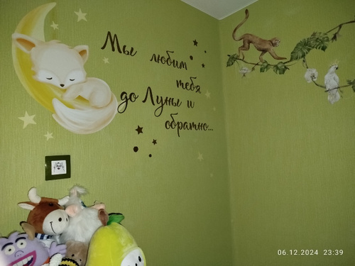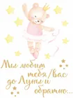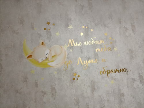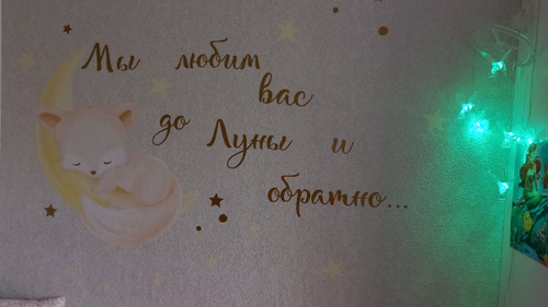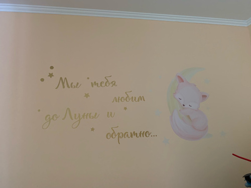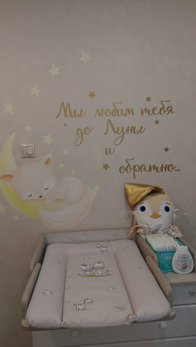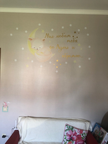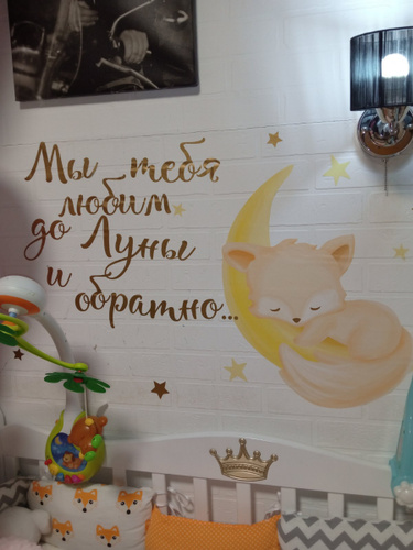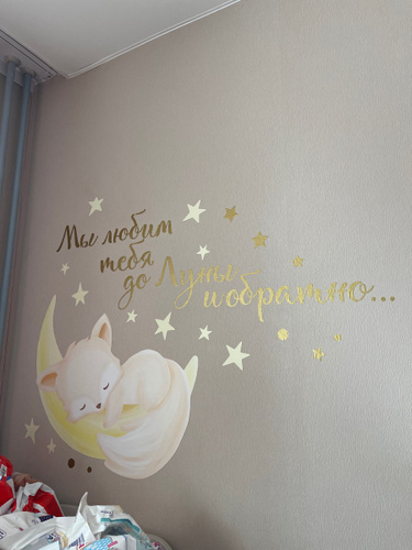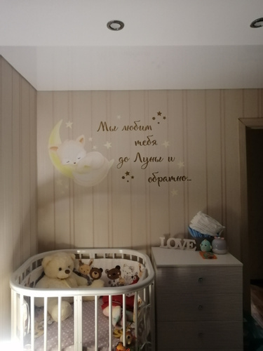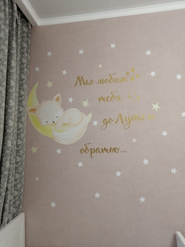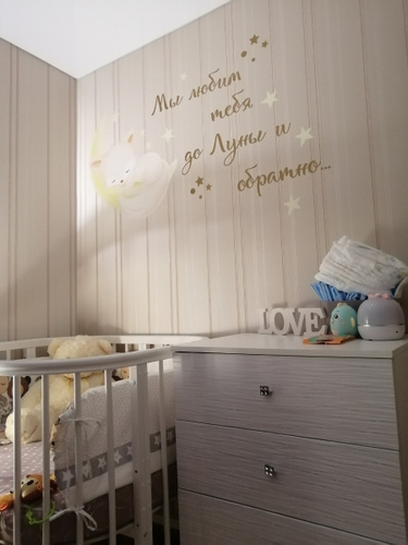 Наклейка надпись на стену интерьерная Мы любим до Луны и обратно с мишкой на Луне. В комплекте наклеек на стену сразу два слова "тебя" и "вас". В зависимости от того один у вас ребенок или несколько, выберите какое слово на стену приклеить. Размер наклеек на фото2. Наклейки детские с мишкой Вы можете расположить в произвольном порядке на любом расстоянии друг от друга и скорректировать площадь занимаемой поверхности. Наклейки на стену подходят для любого помещения. Идеальное украшение стены для детской комнаты или спальни родителй в зоне, где стоит детская кроватка. Так же декоративная наклейка очень мило смотрится в игровой зоне. Подарок ребенку на день рождения или на новоселье. Презент родителям на рождение ребенка, на выписку из роддома. Милые наклейки имеют нежные пастельные тона, которые впишутся в любой интерьер, сделают его особенным. Виниловые стикеры с рисунком очень красиво смотрятся на однотонных обоях - акценты на стене притягивают взгляд. Интерьерный декор удивит Ваших гостей. Наклейки для малышей или наклейки для деток постарше влагостойкие, их можно мыть и использовать в любой комнате, в том числе на кухне и в ванной. Наклейки в детский сад так же можно использовать, т.к они хорошо держаться на любой гладкой поверхности и легки в уходе. Наклейка на дверь или наклейка на мебель или наклейка на шкаф или наклейки для окон - для стикеров подойдет любая ровная поверхность. Стикеры декоративные упакованы в фирменную упаковку, которая сохранит целостность наклеек во время транспортировки, а так же послужит хорошей подарочной упаковкой. Наклейки для мальчиков и наклейки для девочек - декор нейтральный, понравится всем и ни одного малыша не оставят равнодушным. Интерьерные наклейки детские легко наклеить. Для легкой оклейки, ознакомьтесь с инструкцией, она в комплекте. Удалить наклейки без следа можно с любой поверхности, кроме бумаги / бумажных обоев. Виниловые наклейки лучше держатся на гладкой поверхности: виниловые и флизелиновые обои, включая рельефные (в этом случае наклейки могут держаться чуть хуже) или окна или зеркала или ровная твердая мебель или плитка или ламинат. Обновить интерьер без ремонта - это легко и быстро, для этого нужен только декор наклейки от Lisadecor shop. Декор для дома можно использовать для украшения в детском саду или школе, общественных пространствах или кафе и конечно же в детских комнатах на радость вашим любимым деткам!