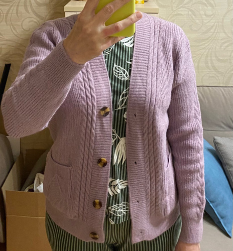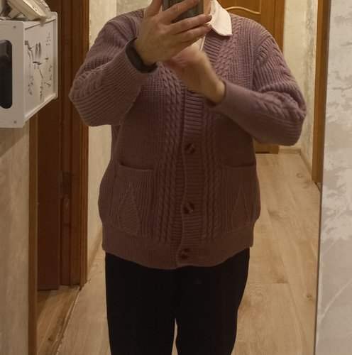 Кардиган понравился. Крупная вязка, красивый цвет. По размеру подошёл идеально, особенно рукава, не надо подворачивать. Пуговицы, правда, хотелось бы другие, но это не проблема... Покупкой довольна.