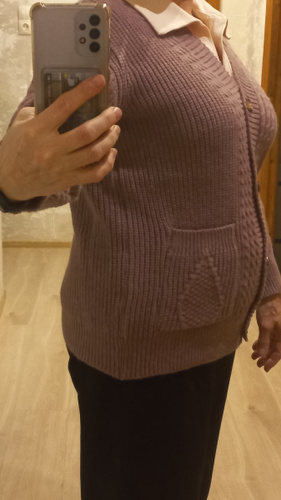 Кардиган понравился очень: по размеру, мягкий, цвет приятный, не броский, петли обработаны хорошо, нигде не торчат нитки, никаких петлей, зацепок нет, рекомендую!