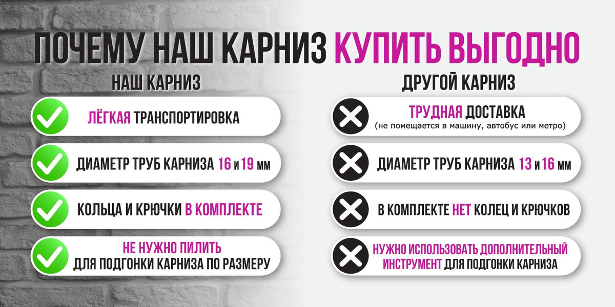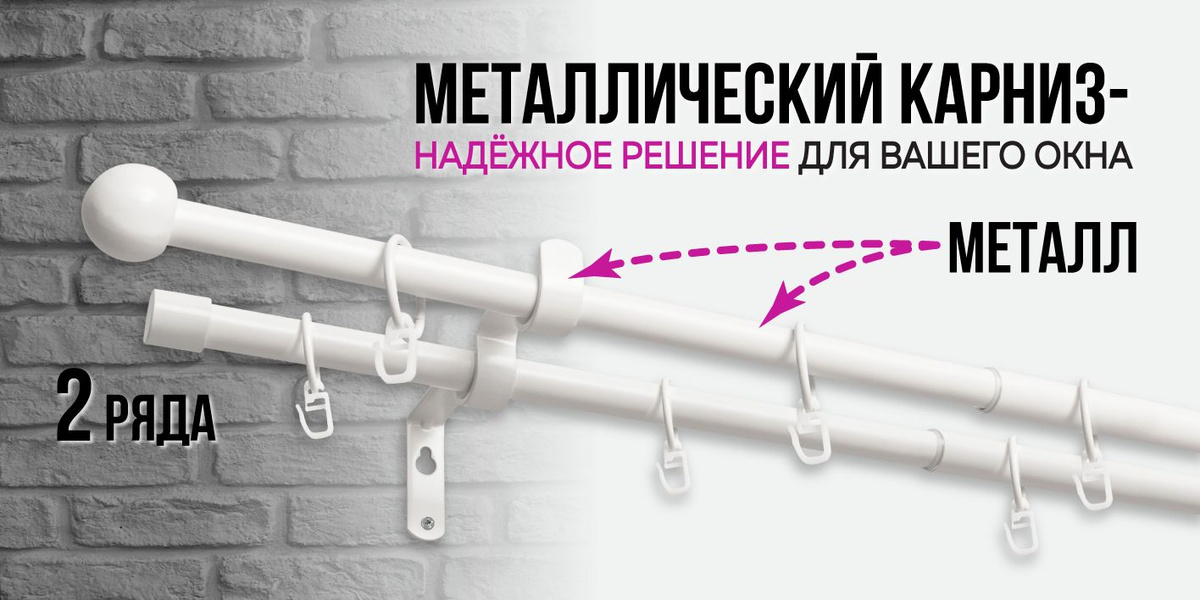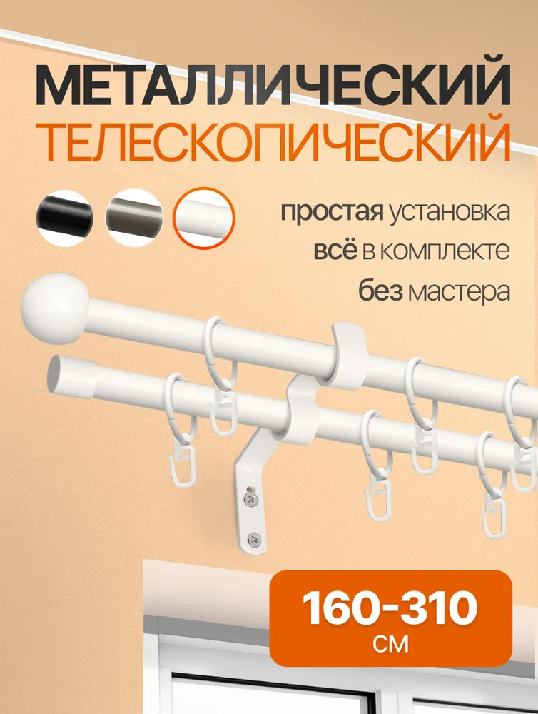 Раздвижная штанга – 2 шт. Наконечники 1-го ряда – 2 шт. Наконечники 2-го ряда – 2 шт. Кронштейны – 3 шт. Кольца с крючками – 60 шт. Винты с дюбелями – 6 шт.