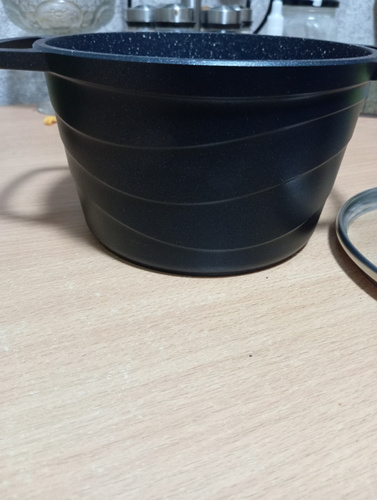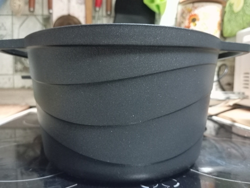 Кастрюля имеет современный прямой корпус из литого алюминия с уникальным геометрическим рисунком «волна».