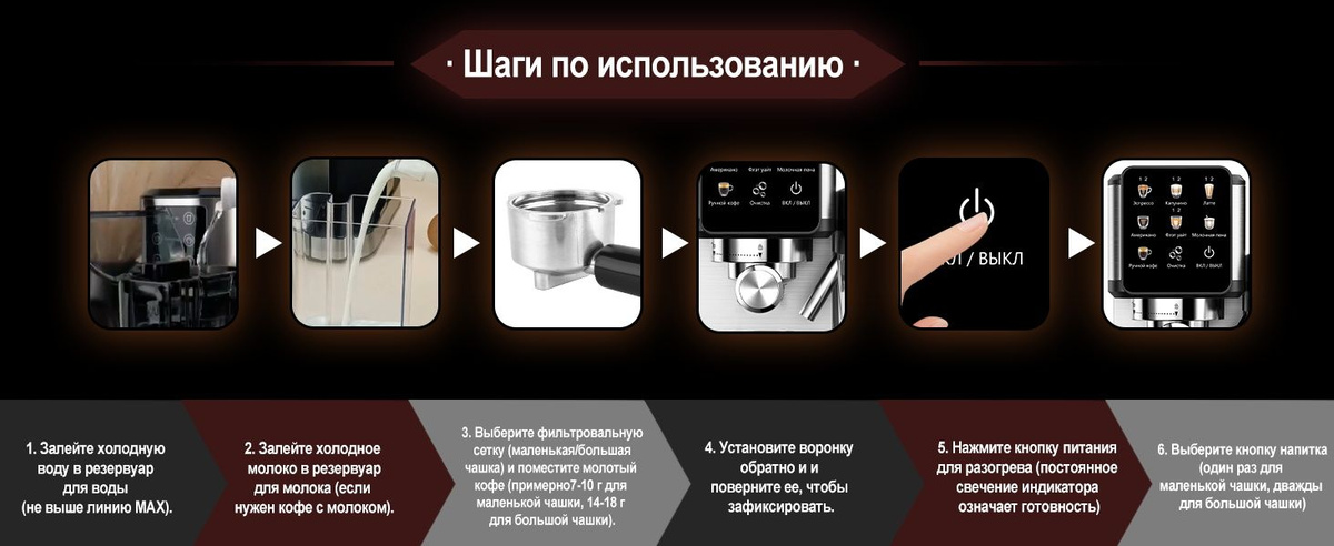 ⏳Этапы работы кофемашиныАвтоматическая кофемашина с интуитивным управлением позволяет приготовить идеальный кофе за 6 шагов: