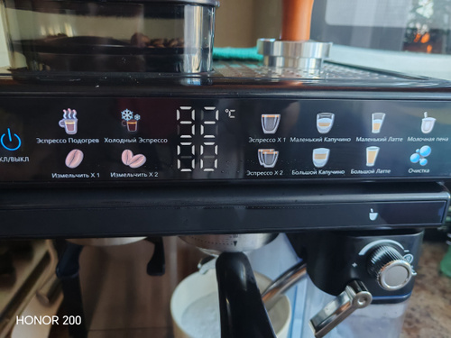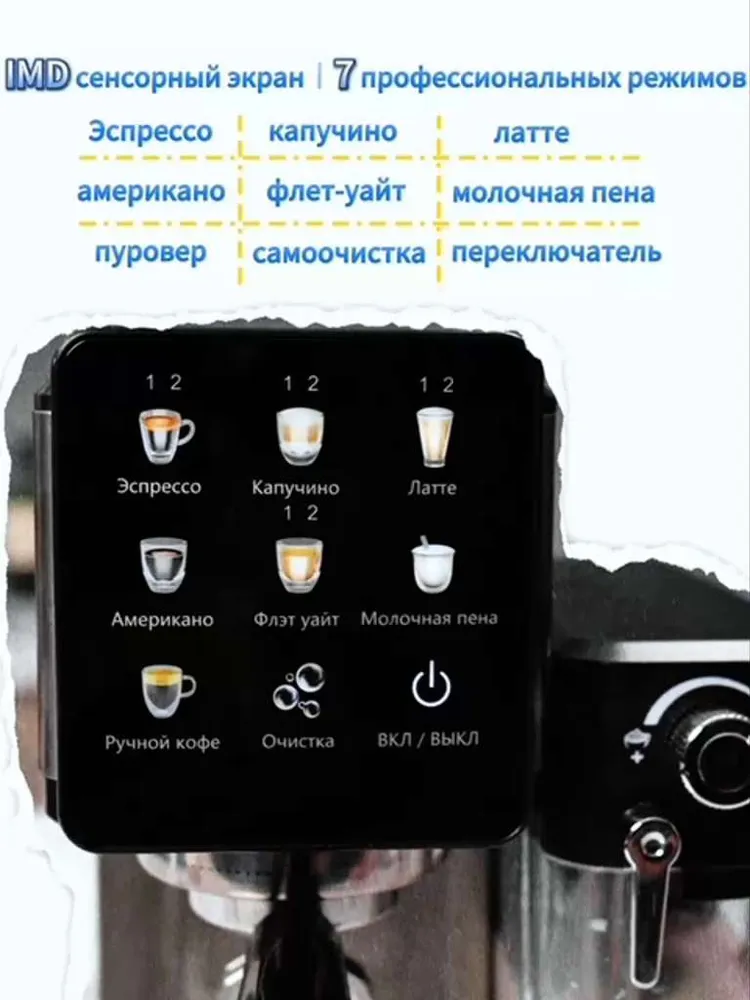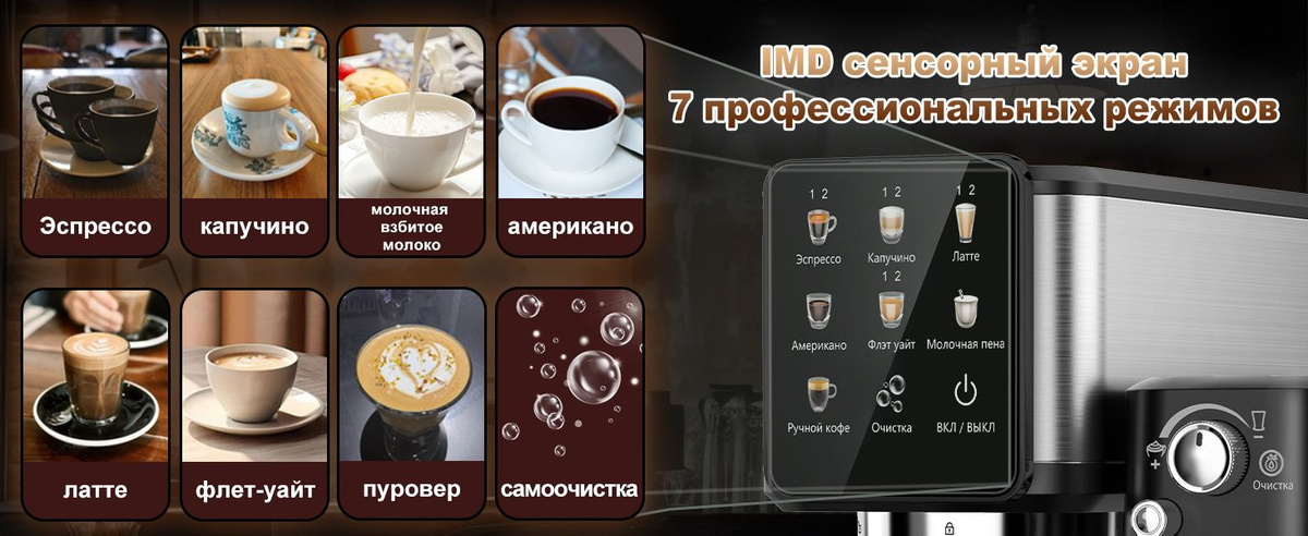 👆IMD сенсорный экран | 7 профессиональных режимовПанель управления (Эспрессо, капучино, латте, американо, флет-уайт, молочная взбитое молоко, пуровер,самоочистка, переключатель)