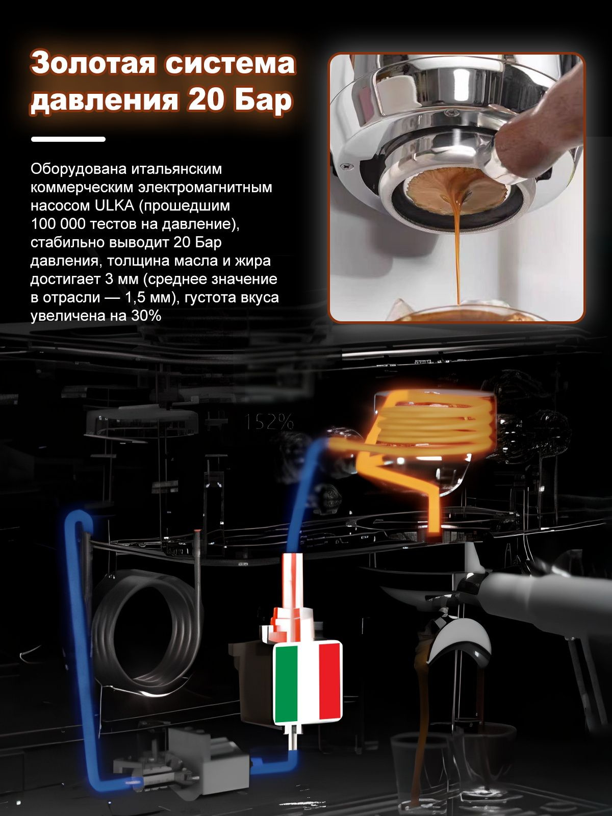 ❤️Золотая система давления 20 БарАвтоматическая кофемашина оснащена итальянским коммерческим электромагнитным насосом ULKA (прошедшим 100 000 испытаний на давление), который стабильно обеспечивает давление 20 Бар. Толщина кофейной крема-пенки (кэrema) достигает 3 мм (при среднем отраслевом значении 1,5 мм), что усиливает насыщенность вкуса на 30% по сравнению с традиционными системами.